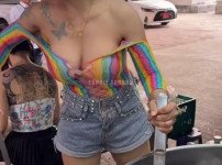 데님 브라탑 안에 흰 비키니를 입은 하이키 옐 묵직한 태닝 가슴골